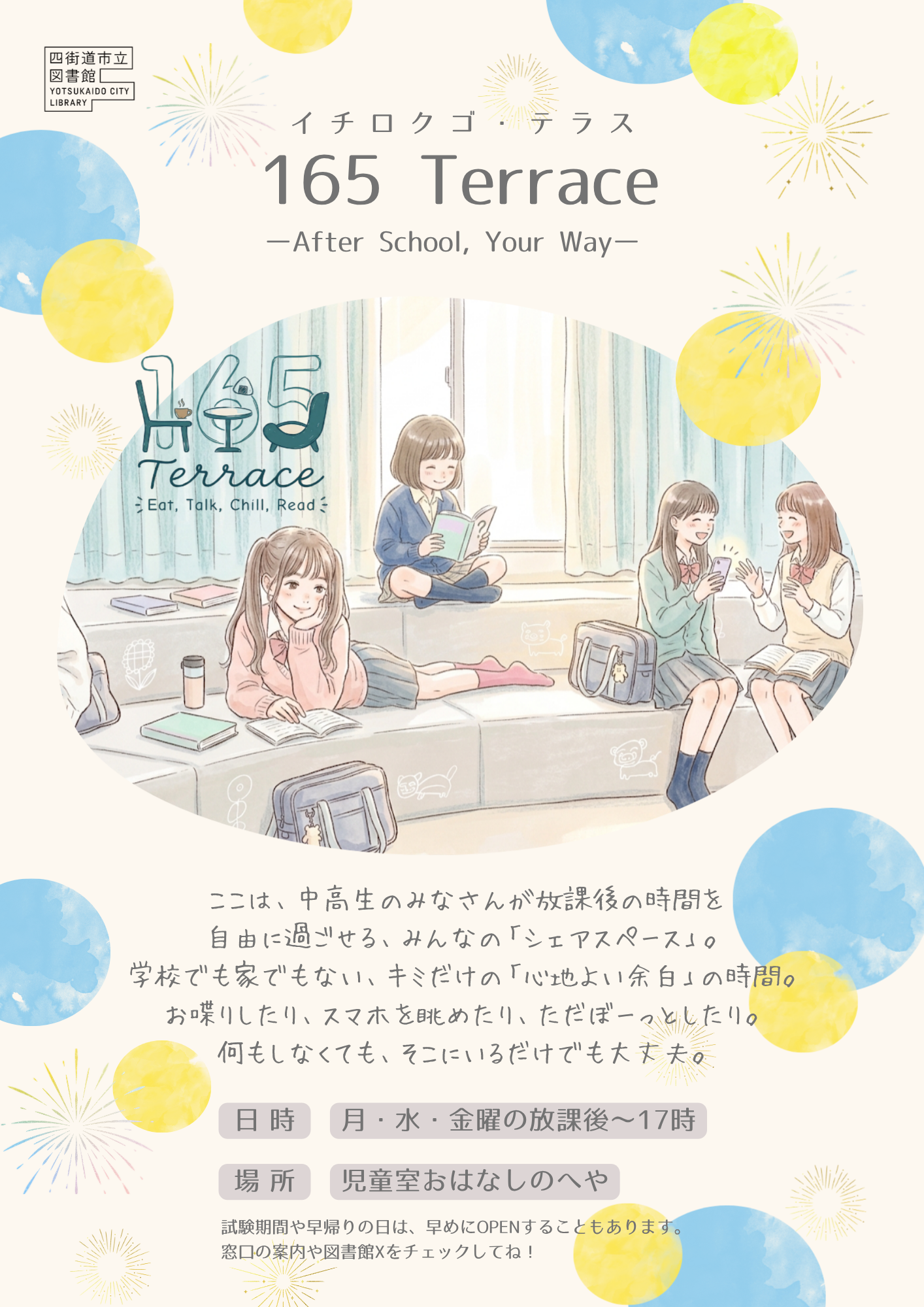 中高生のみなさんが放課後の時間を自由に過ごせる、みんなのシェアスペース「165TERRACE」を5月1日(金)から開設します。