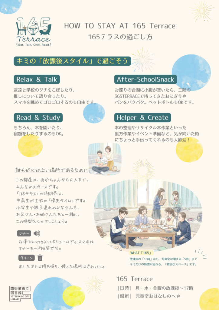 | Relax & Talk: 友達とお喋り、スマホ、ただぼーっとするのもOK。 After-SchoolSnack:おなかがすいたら三階の365TERRACEでおにぎりやパンを食べてもOK。 Read & Study: 読書や学校の宿題、タブレット学習に。 Helper & Create: 本の整理やPOP作りなど、図書館の裏方のお手伝い。 (図書部の活動も行っています。興味ある人はぜひ参加してみて。) |