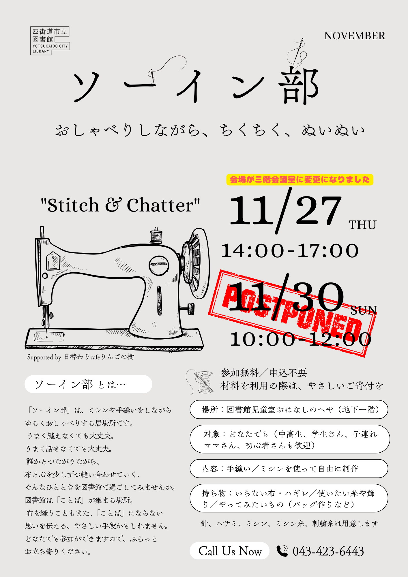 ソーイン部 -おしゃべりしながら、ちくちく、ぬいぬいー(11月27日開催)