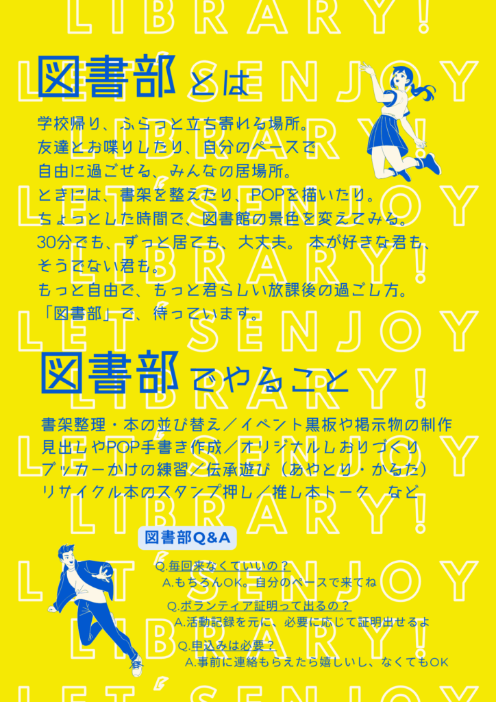 | 内容 | 書架整理、本の並び替え、イベント黒板や掲示物の制作、見出しやPOP手書き作成、しおりづくり、ブッカーかけの練習、伝承遊び(あやとり、かるたなど)、リサイクル本のスタンプ押し、推し本トーク など |