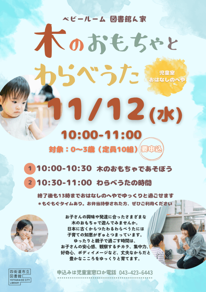 わらべうたは10:30~はじめます。ゆっくりとお子さんのペースにあわせてお越しください。