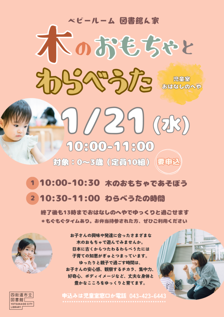 お子さんの興味や発達に合った様々な木のおもちゃで遊びませんか。日本に古くから伝わるわらべうたには子育ての知恵がぎゅっとつまっています。ゆったりと親子で過ごす時間は、豊かな心をゆっくりと育てます。