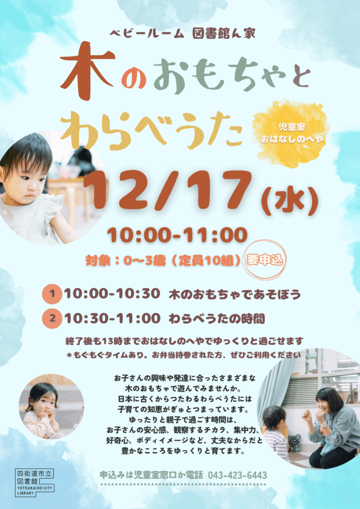 お子さんの興味や発達に合った様々な木のおもちゃで遊びませんか。日本に古くから伝わるわらべうたには子育ての知恵がぎゅっとつまっています。ゆったりと親子で過ごす時間は、豊かな心をゆっくりと育てます。