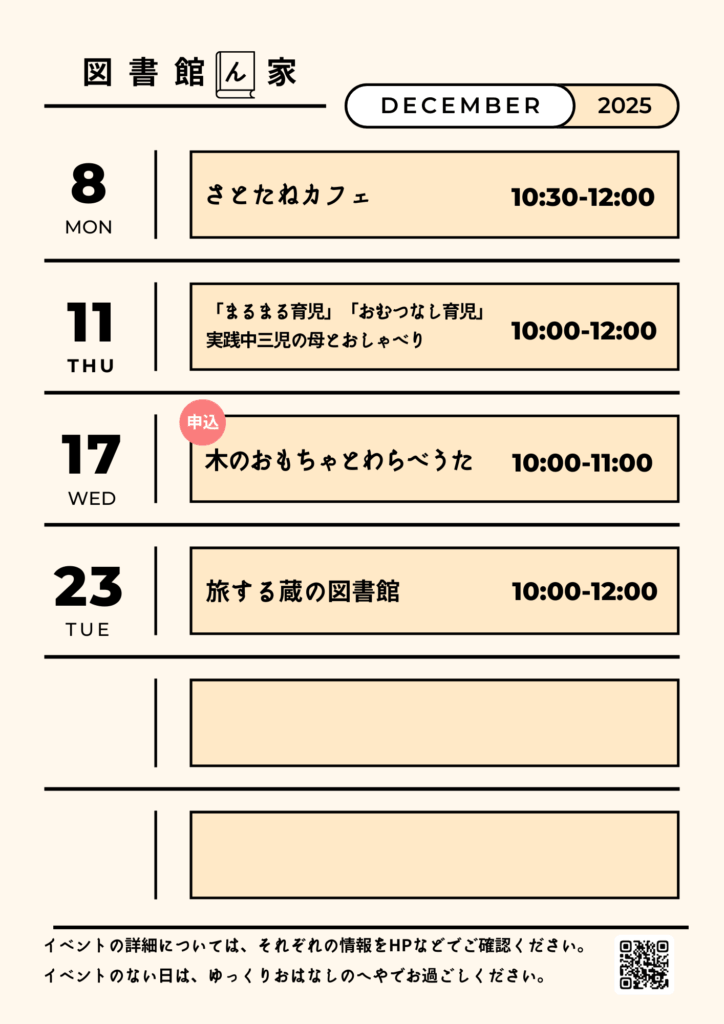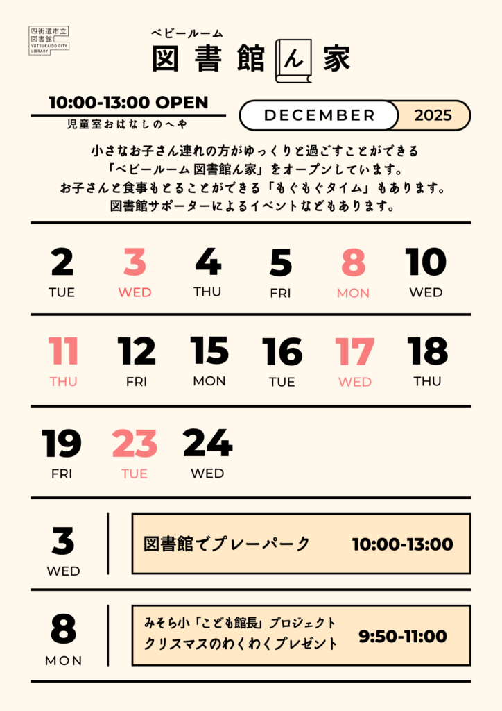 小さなお子さん連れの方がゆっくりと過ごすことができる「ベビールーム 図書館ん家」をオープンしています。お子さんと食事もとることができる「もぐもぐタイム」もあります。図書館サポーターによるイベントなどもあります。ぜひお子さんと図書館へお出かけください。